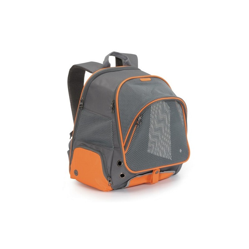 Pratico e funzionale zainetto trasportino, nella tonalità bicolore grigio/arancione.